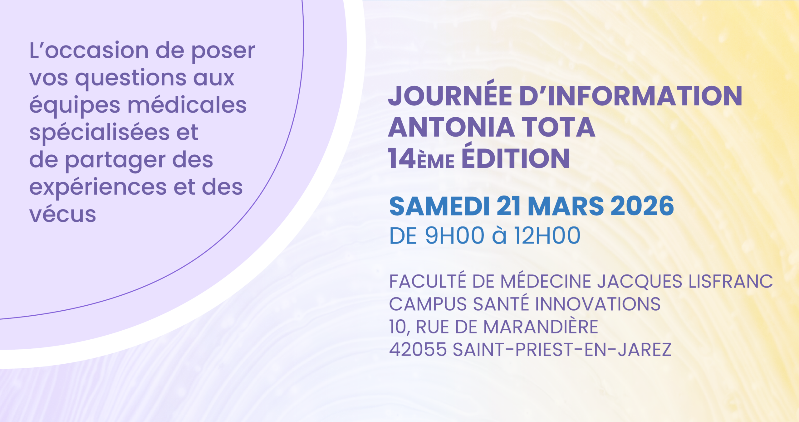 14ème éditionJOURNÉE D’INFORMATION ANTONIA TOTA SAMEDI 21 MARS 2026 de 09H00 à 12H00 Faculté de médecine Jacques Lisfranc Campus Santé Innovations 10 rue de Marandière42055 Saint-Priest-en-Jarez 14ème éditionJOURNÉE D’INFORMATION ANTONIA TOTA SAMEDI21 MARS 2026 de 09H00 à 12H00 Faculté de médecine Jacques Lisfranc Campus Santé Innovations Amphithéâtre Georges Riffat 10 rue de Marandière42055 Saint-Priest-en-Jarez Je souhaite m’inscrire ! Dokalys, c’est une chance d’échanger avec des équipes médicales spécialisées, de poser vos questions et de partager vos expériences et témoignages. Dokalys, c’est une chance d’échanger avec des équipes médicales spécialisées, de poser vos questions et de partager vos expériences et témoignages. COMMENT PARTICIPER À LA JOURNÉE ? Remplissez le formulaire d’inscription Choisissez un atelier au choix et posez vos questions de façon anonyme Participez à la réunion LE PROGRAMME DE LA JOURNÉE Le programme de 2026 est bientôt disponible ! INSCRIPTION Je souhaite m’inscrire ! Voir le plan d’accès du lieu ! ASSOCIATIONS PATIENTS PARTENAIRES SOUTIENS INSTITUTIONNELS